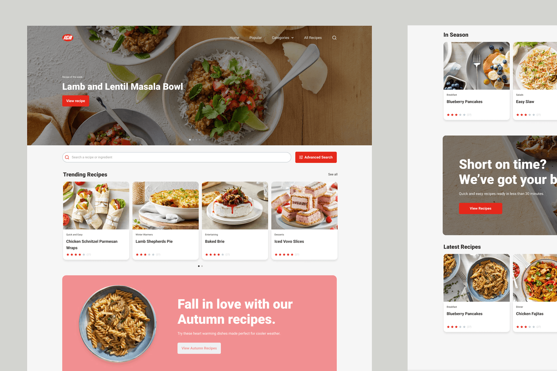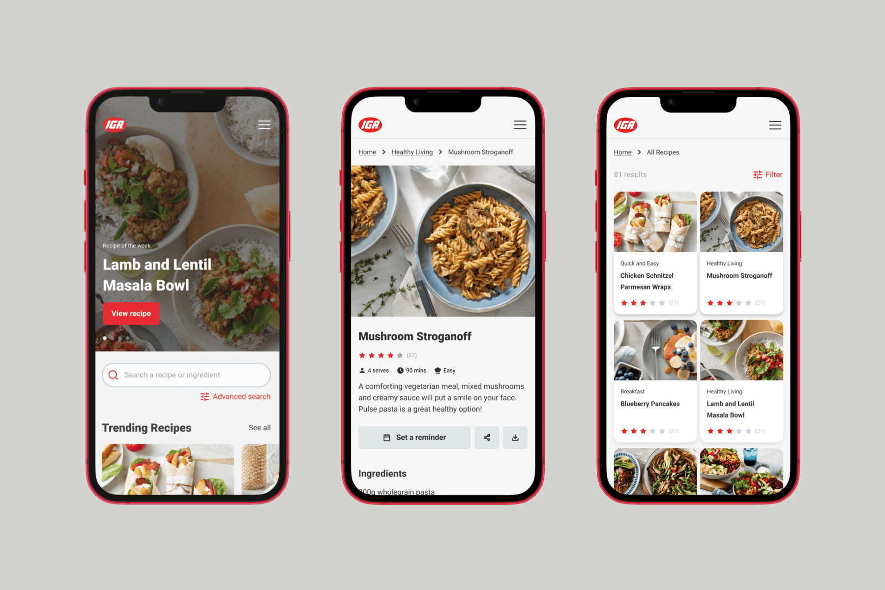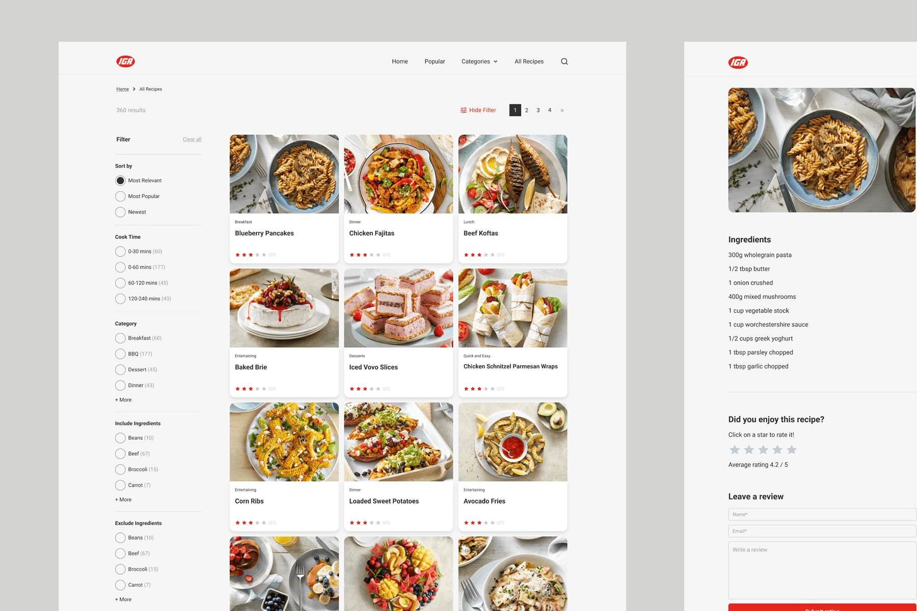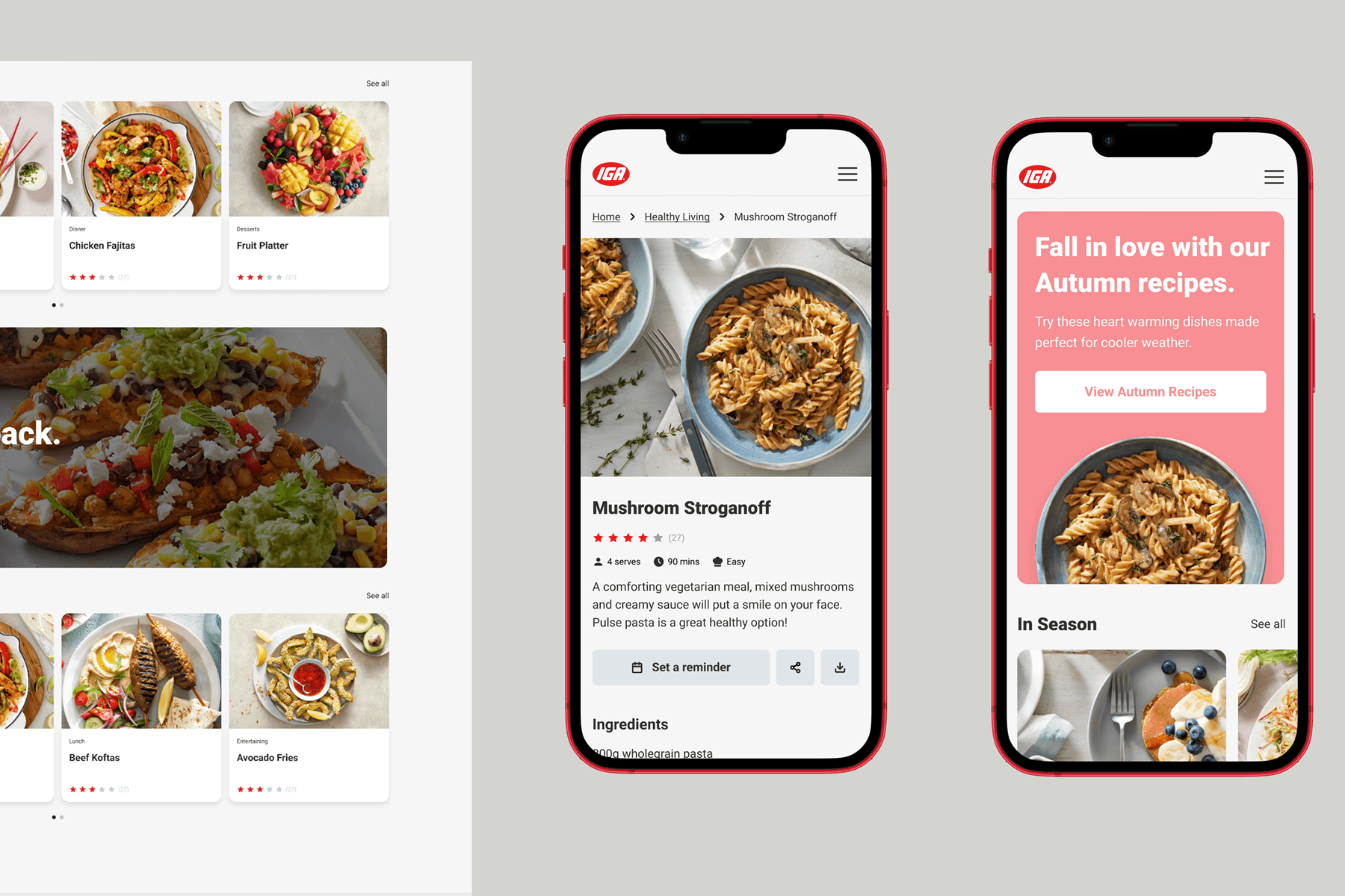 The IGA recipes website faced major usability issues and low engagement. Using research, we uncovered key pain points around recipe discovery, search, and interaction. We redesigned the homepage to surface popular and seasonal content, enhanced the search experience with predictive results and advanced filters, and introduced new features like recipe ratings and calendar reminders. The updates resulted in improved engagement, reduced bounce rates, and stronger brand affinity from IGA customers.