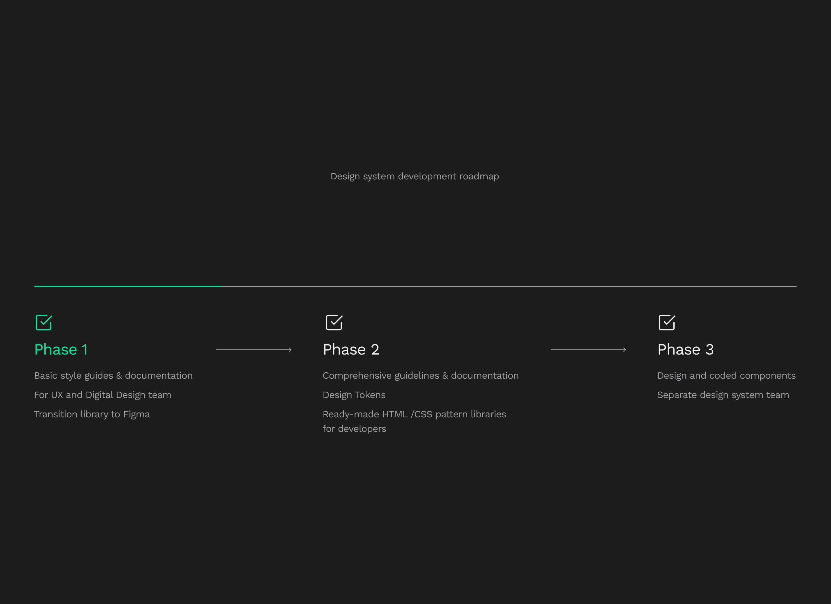 My approach was to divide the development into phases, with phase 1 being the current state, where we focused on building a design system with a library of reusable components, guidelines, and brand assets, organised in an atomic design structure and eventually transition the system over to a more powerful tool in Figma. Subsequent phases could focus on exploring building a more comprehensive design system to enable developers to copy and paste reusable blocks of code.