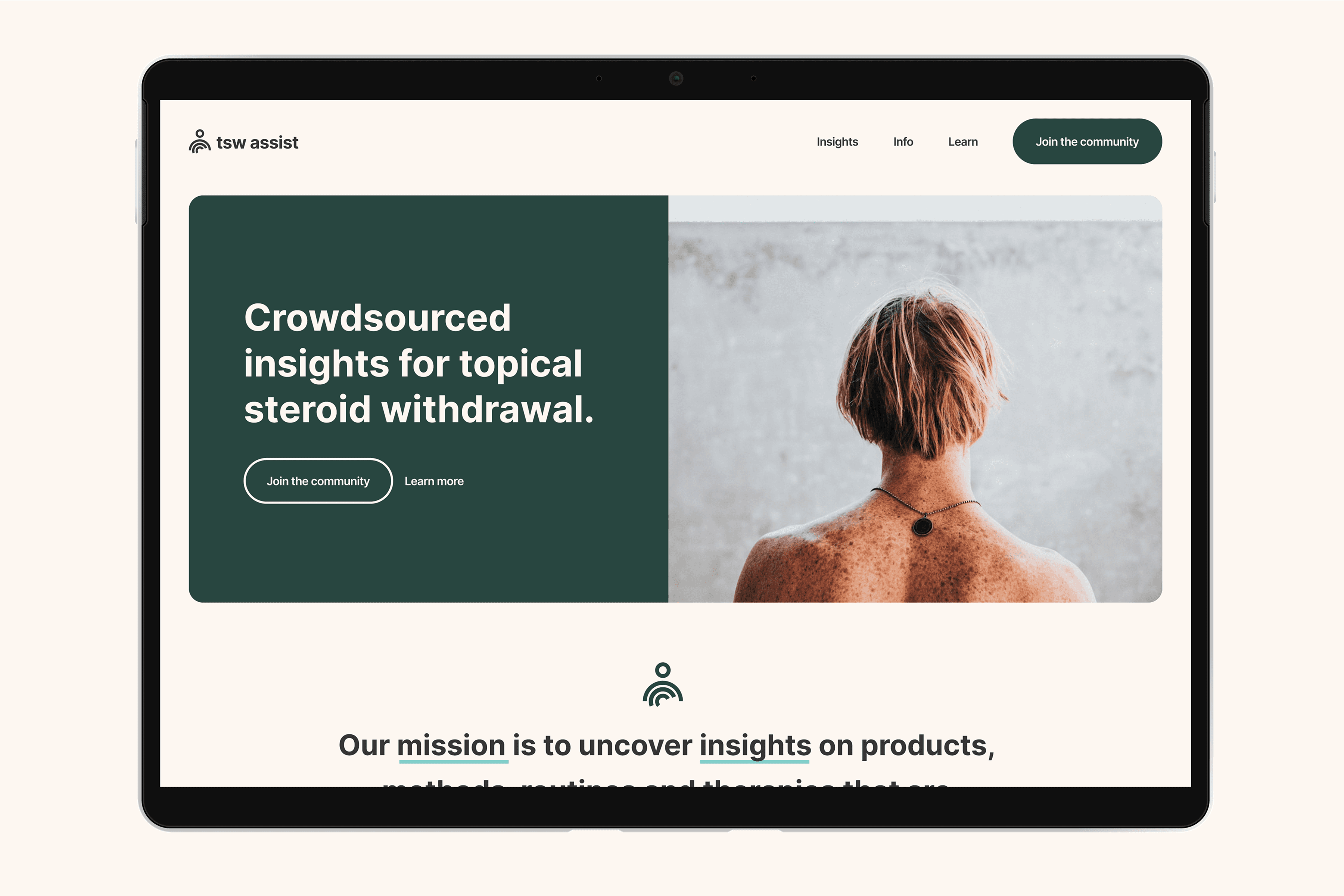 I worked with TSW Assist to refine their brand purpose and reposition their platform as a credible, supportive resource for people experiencing topical steroid withdrawal (TSW). Through a focused discovery session, we clarified their mission to better reflect the lived experiences and knowledge within the TSW community.